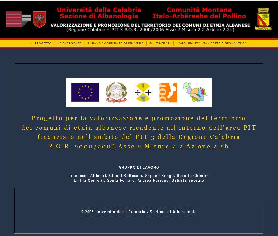(1) La prima pagina del sito del "Progetto per la valorizzazione e promozione del territorio dei comuni di etnia albanese” della Comunità Montana del Pollino è stata modificata il 24 Settembre 2009, a seguito della mia segnalazione. Questo è il sito ufficiale del progetto dopo l'aggiornamento.