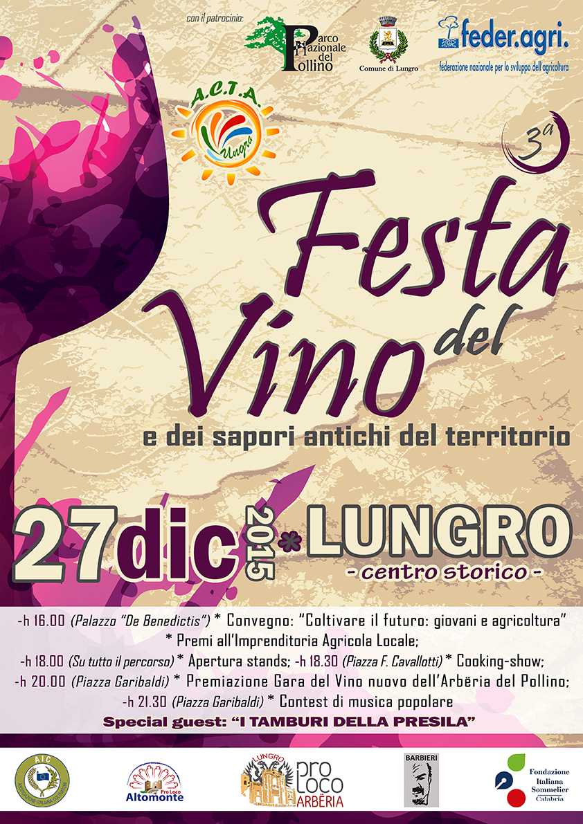 Il 27 dicembre l’associazione culturale Acta Ungra, con il patrocinio del Comune di Lungro, del Parco Nazionale del Pollino e di Feder. Agri propone per la terza edizione la “Festa del vino”.
