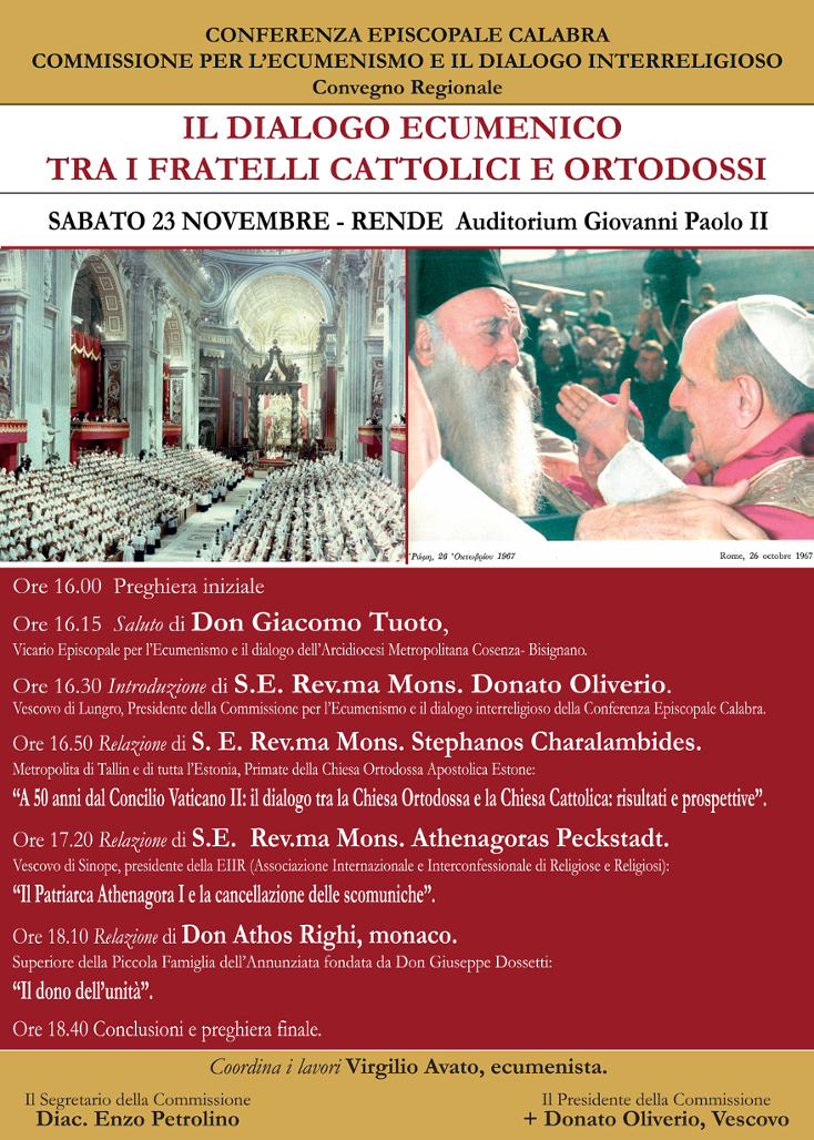 Sabato 23 novembre, a Rende, al palacultura Giovanni Paolo II del Seminario teologico cosentino dell’arci-diocesi di Cosenza–Bisignano, si è tenuto un convegno regionale sul dialogo ecumenico tra cattolici e ortodossi, a cinquant’anni dal concilio Vaticano II e dallo storico abbraccio tra Papa Paolo VI e il patriarca di Costantinopoli Atenagora, e sulla cancellazione delle scomuniche del 1054. L’incontro è stato organizzato dalla commissione per l’ecumenismo e il dialogo interreligioso della Conferenza episcopale calabra presieduta dal vescovo di Lungro degli Italo–Albanesi dell’Italia Continentale, Donato Oliverio.