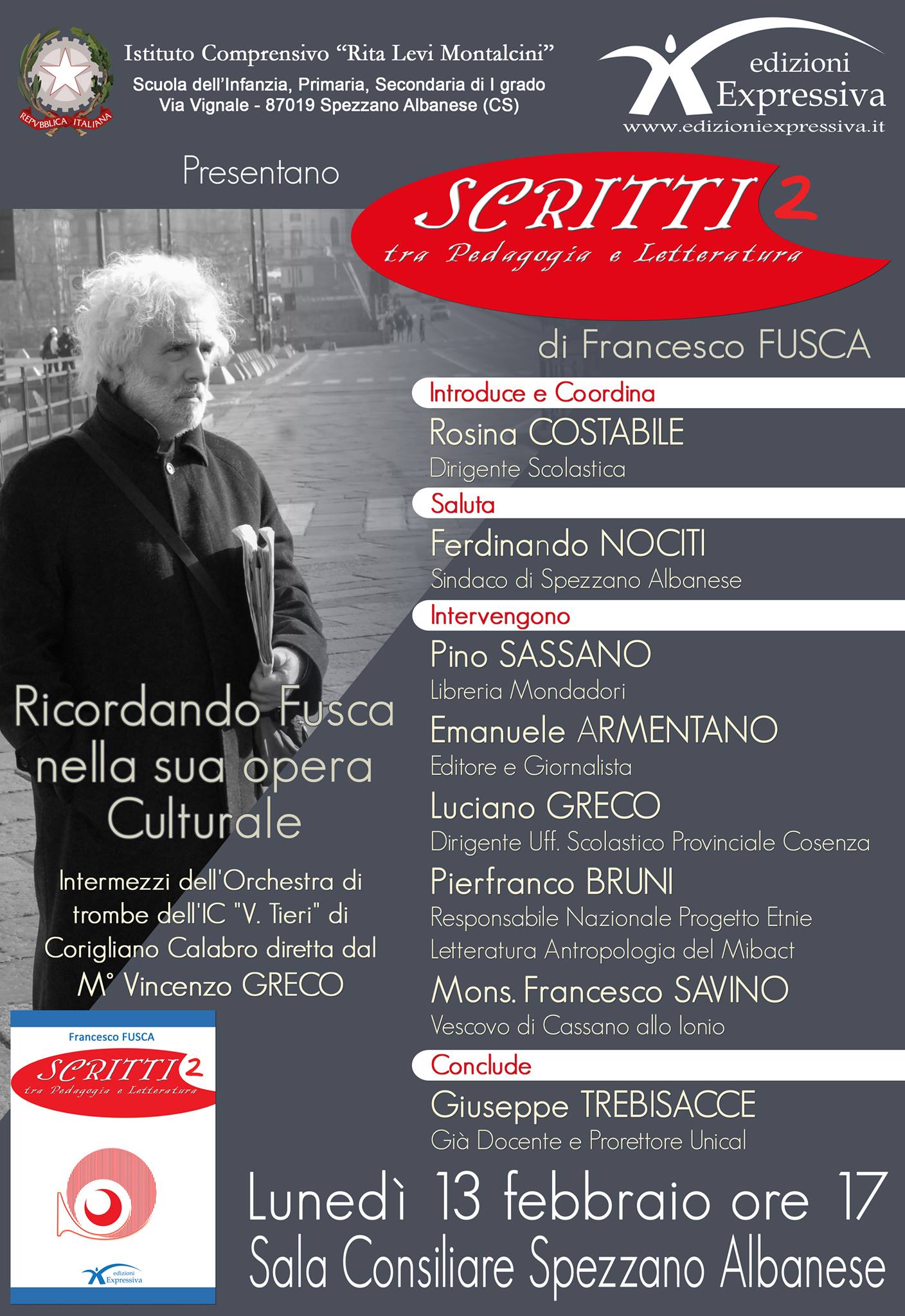 Per far ciò sono stati chiamati a intervenire gli amici di una vita di Fusca, proprio per ripercorrere un cammino di vita dedicato, appunto, alla moltiplicazione culturale. In tal senso i lavori, coordinati dalla stessa Costabile, vedranno i saluti del sindaco arbëresh Ferdinando Nociti e gli interventi del libraio Pino Sassano, dell'editore Emanuele Armentano, del dirigente dell'USP di Cosenza Luciano Greco, del responsabile Progetto Etnie del MibAct Pierfranco Bruni, e del vescovo di Cassano Jonio mons. Francesco Savino. A concludere il dibattito sarà il già prorettore e docente Unical Giuseppe Trebisacce. Durante la serata ci saranno intermezzi dell'Orchestra di trombe del Comprensivo “V. Tieri” di Corigliano, diretta dal M° Vincenzo Greco. L'evento si terrà lunedì 13 febbraio alle ore 17 presso la sala consiliare del Comune di Spezzano Albanese.