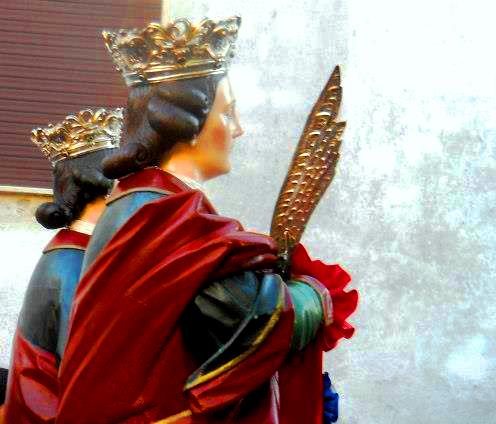 I portantini fanno fatica a sollevare il piedistallo in legno massiccio e trasportarlo tra le vinelle di Strigar in salite impossibili e in discese sdrucciolevoli, ma non demordono, e continuano senza cambi. "A spala... a spala. A mano... a mano..." si passano gli ordini con i cassanesi, devoti da fuori confine, gli strigarioti che condividono con essi ogni sforzo. L'organetto dell'anziano di Acquaformosa si intrufola tra gli squilli della banda e le nenie italo-greco-albanesi delle devote che seguono le statue. Davanti ai loro usci donnine canute attendono con guantiere ricolme di caramelle d'ogni tipo e di confetti e al loro incedere al centro della via si ferma il corteo e si cala il piedistallo sulle sue quattro gambe. Fiato per le spalle che reggono il peso della santità e tempo per le mani scolpite dagli anni e dall'artrite per inondare di zucchero artificiale i santi piedi di Cosma e Damiano e infilare nel fessura del tavolo un'offerta. Le mani del portantino che sta dietro i Santi rapide le raccolgono e le passano velocemente sul palmo delle tante mani dei fedeli più vicini. Verso l'ultimo sole già al tramonto, nel crepuscolo acceso dalle luminarie la banda incalza il ritmo e il volume e sale la processione al santuario rivestito di icone affrescate: stipati sotto le navate i fedeli attendono l'ultima benedizione, con le mani veloci sfiorano i piedi dolciastri delle statue per un bacio traboccante di fede. (gb2012)