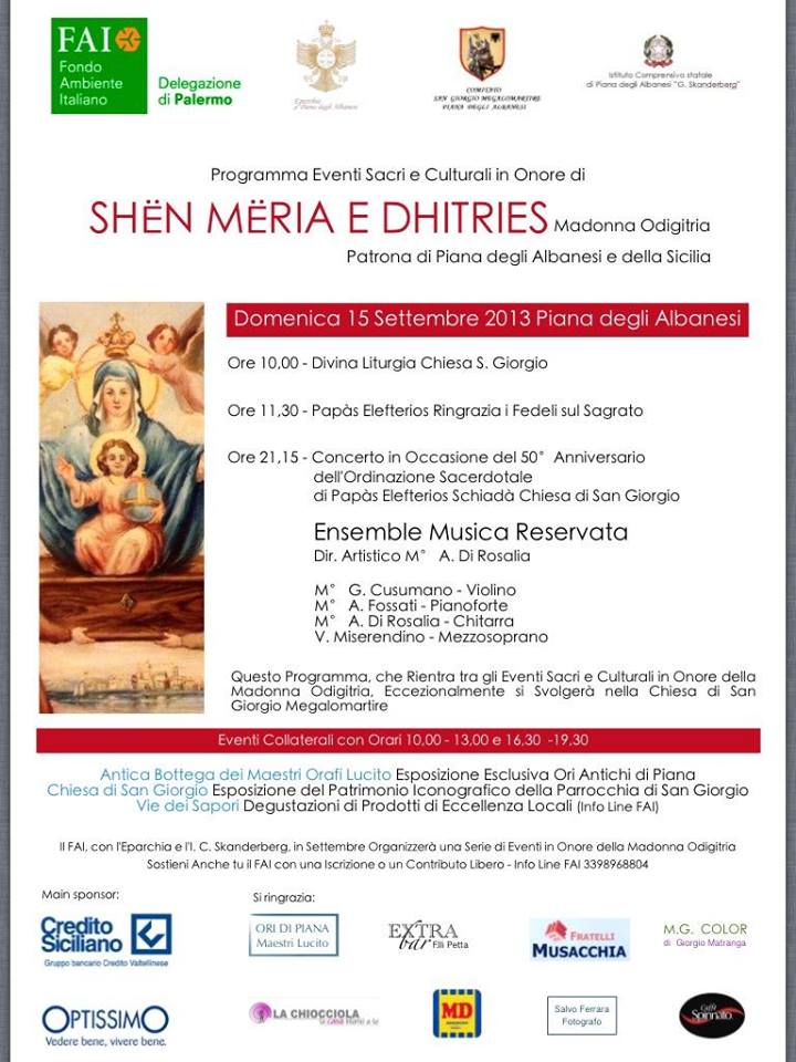 Il Gruppo Fai di Piana degli Albanesi festeggia il 50° anniversario dell'ordinazione sacerdotale di Papàs Elefterios Schiadà, rettore della chiesa di San Giorgio Megalomartire, patrono di Piana degli Albanesi. Per la speciale occasione la Delegazione Fai di Palermo, il Gruppo di Piana degli Albanesi, con l'Eparchia e l'I. C. Skanderberg, hanno deciso di organizzare un concerto di musica sacra dedicato alla Madonna Odigitria.