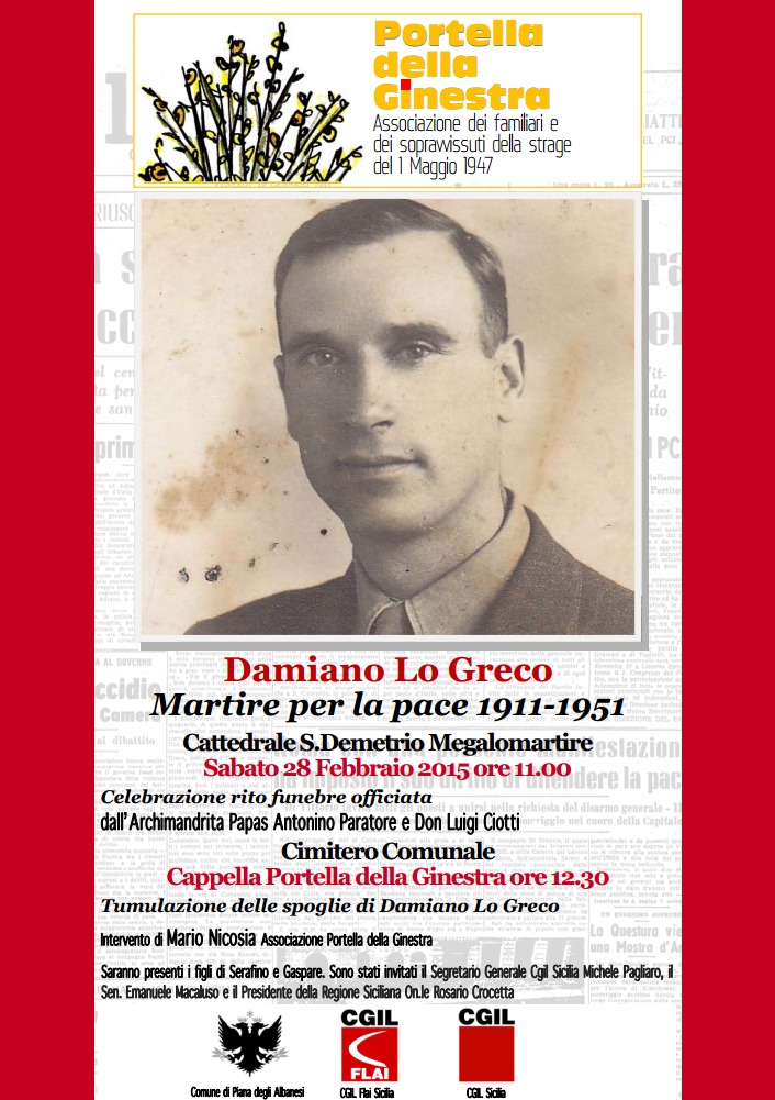La vicenda di Damiano Lo Greco sarà rilanciata domani a Piana degli Albanesi, nell’aula consiliare del Comune, alle ore 17, su iniziativa di Cgil e Flai, in occasione della presentazione dell’inchiesta condotta da Francesco Petrotta sull’omicidio Lo Greco e pubblicata dalla casa editrice Istituto poligrafico europeo con il titolo “Quando Scelba imperava”- Inchiesta sull’uccisione di Damiano Lo Greco”. Dall’inchiesta emergerebbe con chiarezza che le forze dell’ordine depistarono le indagini mentre la magistratura poco o niente fece per scoprire la verità e colpire i responsabili dell’omicidio.