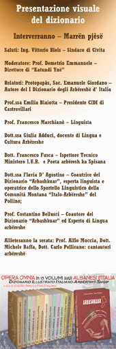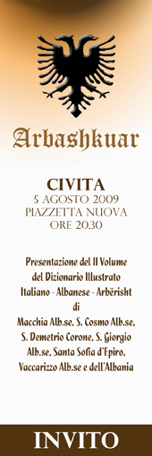 A Civita, il prossimo 5 agosto, verrà presentato il secondo volume del vocabolario illustrato Arbashkuar: italiano - albanese - arbërisht, nelle parlate di Macchia, San Cosmo, San Demetrio Corone, San Giorgio, Santa Sofia d'Epiro, Vaccarizzo e dell'Albania.