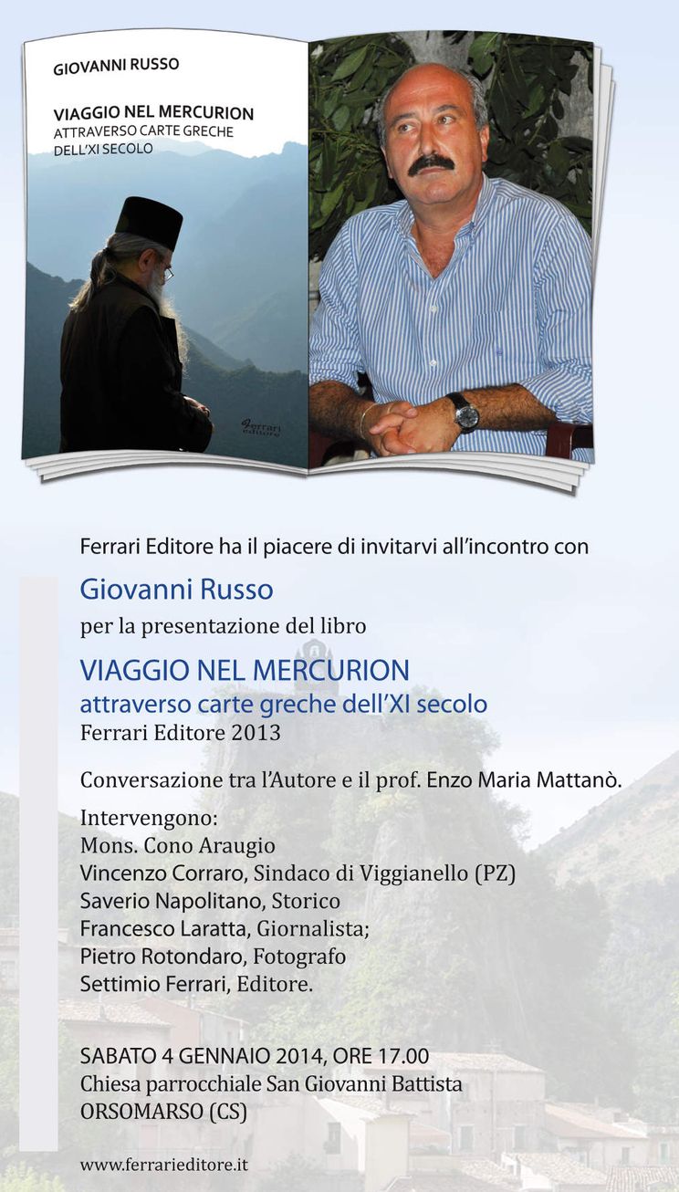Sabato 4 gennaio 2014, alle ore 17:00 presso la chiesa parrocchiale di San Giovanni Battista in Orsomarso (CS), il Prof. Enzo Mattanò presenterà il nuovo libro di Giovanni Russo "Viaggio nel Mercurion attraverso carte greche del secolo XI".